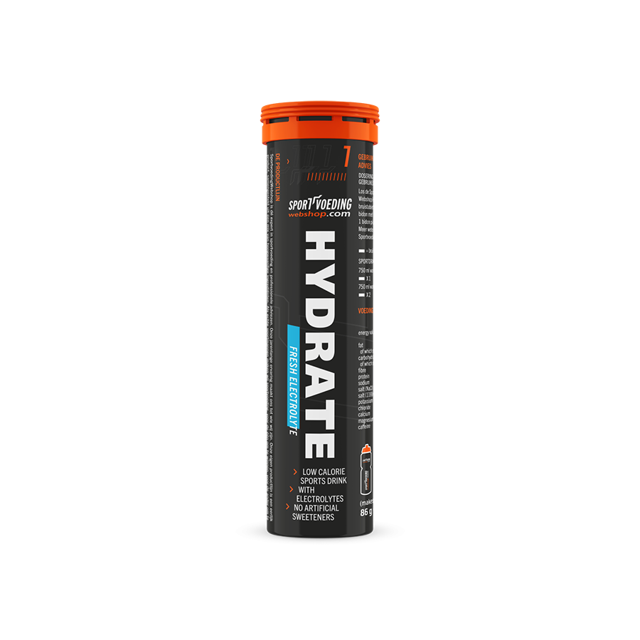Ben je op zoek naar een sportdrank zonder koolhydraten, maar wel met de belangrijkste elektrolyten? Kies dan voor een elektrolyten bruistabletten drank zoals Hydrate Electrolyte. Deze bevatten geen energie, maar helpen je wel voldoende gehydrateerd te blijven en de belangrijkste mineralen aan te vullen. Hydrate is veruit onze meest verkochte elektrolyten drank.