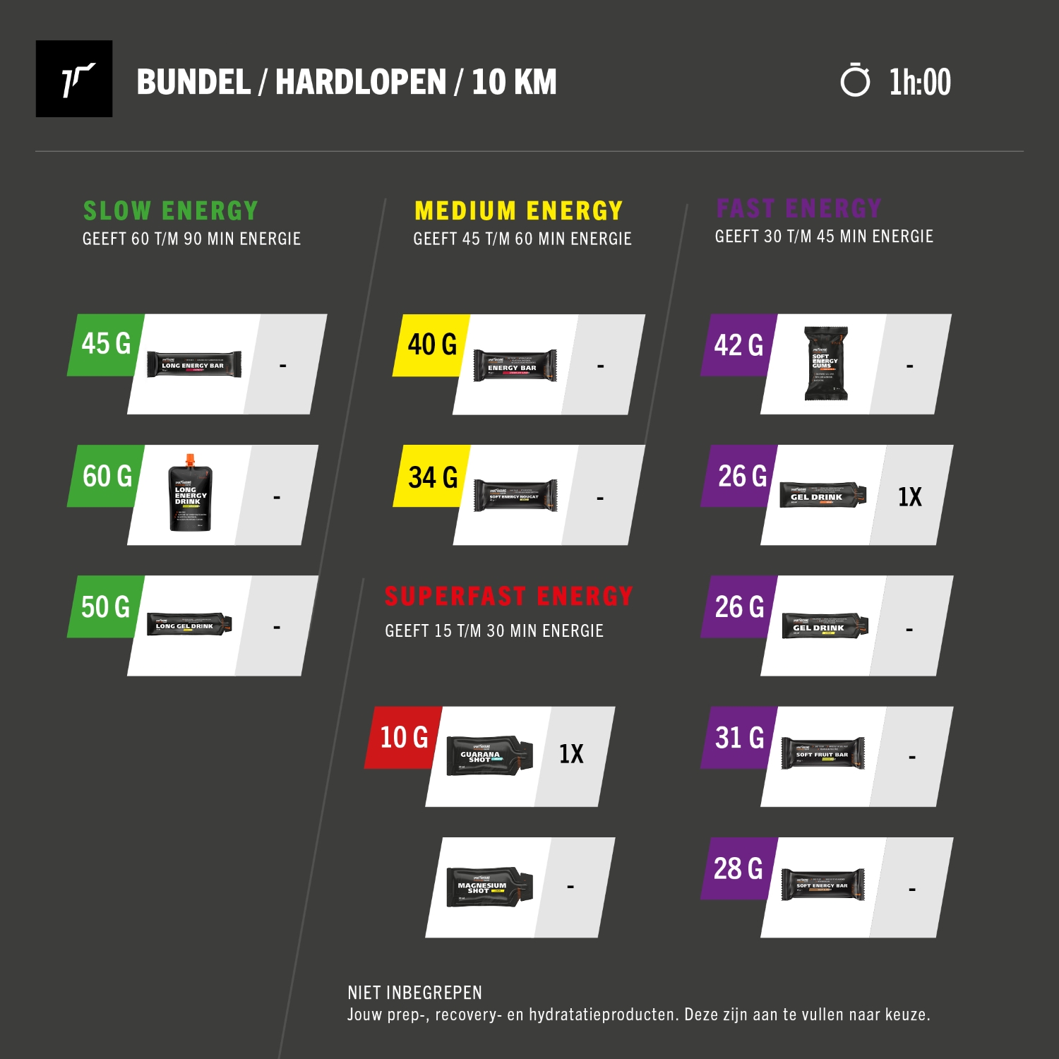 Deze bundel bevat alle producten die jij nodig hebt om een super snelle 10 km te lopen rond de 1:00 uur. Door middel van het schema weet je éxact welke product je wanneer moet innemen.