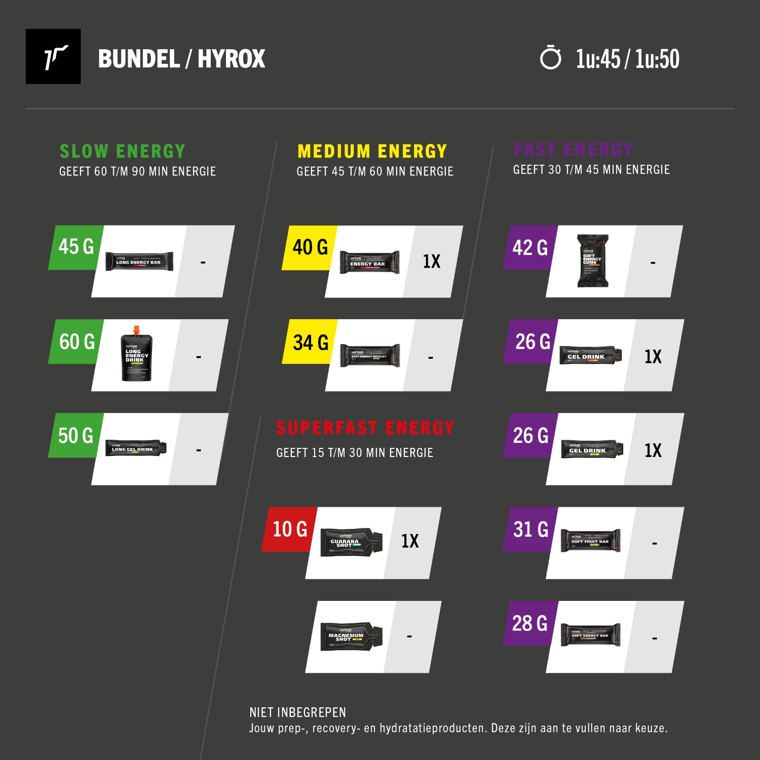 Deze bundel bevat alle producten die jij nodig hebt om een super snelle Hyrox af te leggen in 1:45 uur. Door middel van het schema weet je éxact welke product je wanneer moet innemen.