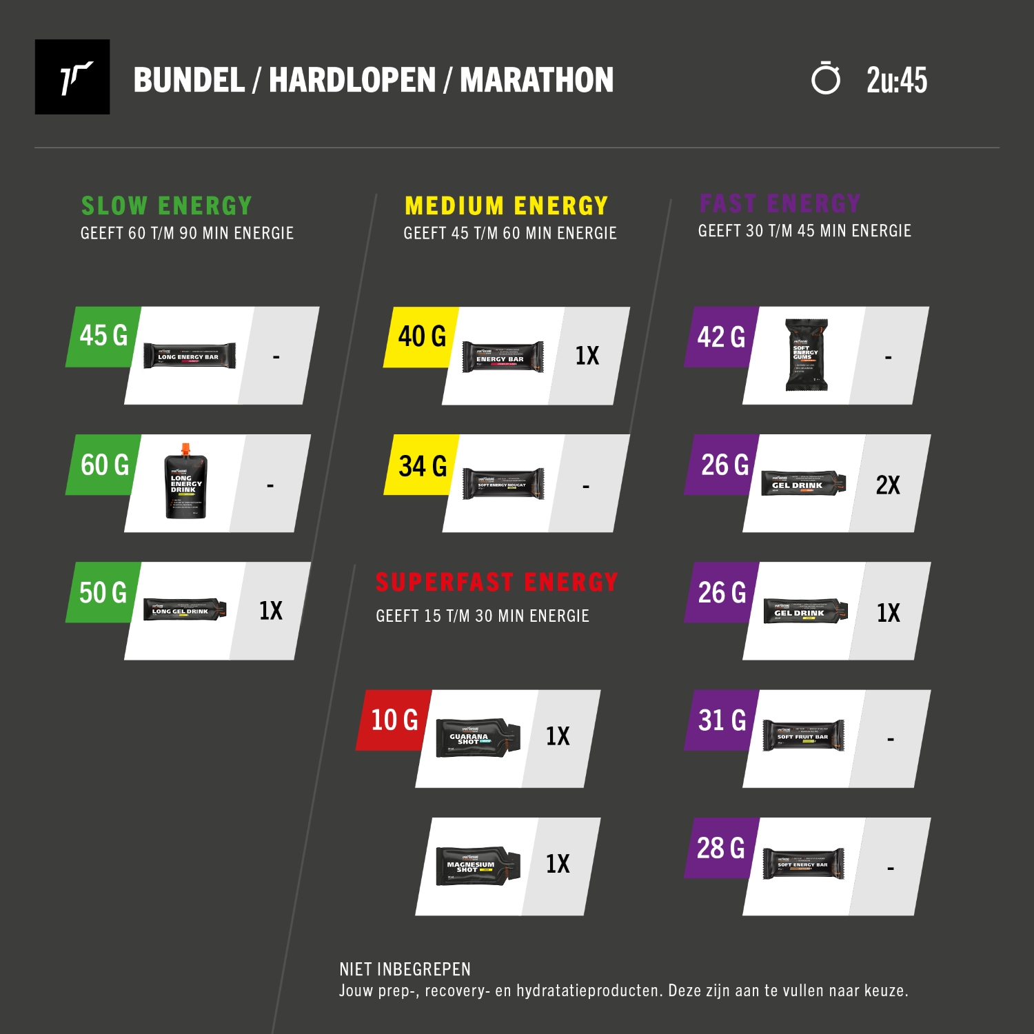 Deze bundel bevat alle producten die jij nodig hebt om een super snelle tijd te lopen van 2:45. Door middel van het schema weet je éxact welke product je wanneer moet innemen.