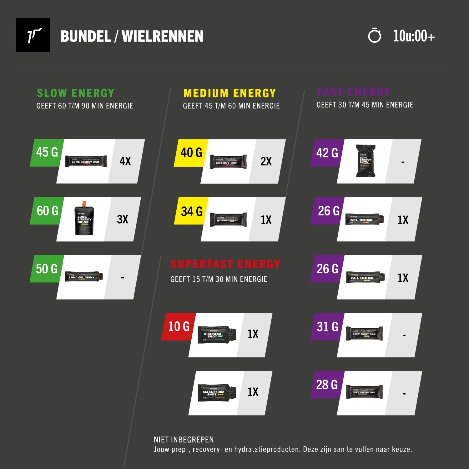 Deze bundel bevat alles wat je nodig hebt om je wielerrit van ongeveer 10:00 uur in een razendsnel tempo af te leggen. Door middel van het schema weet je éxact welke product je wanneer moet innemen.