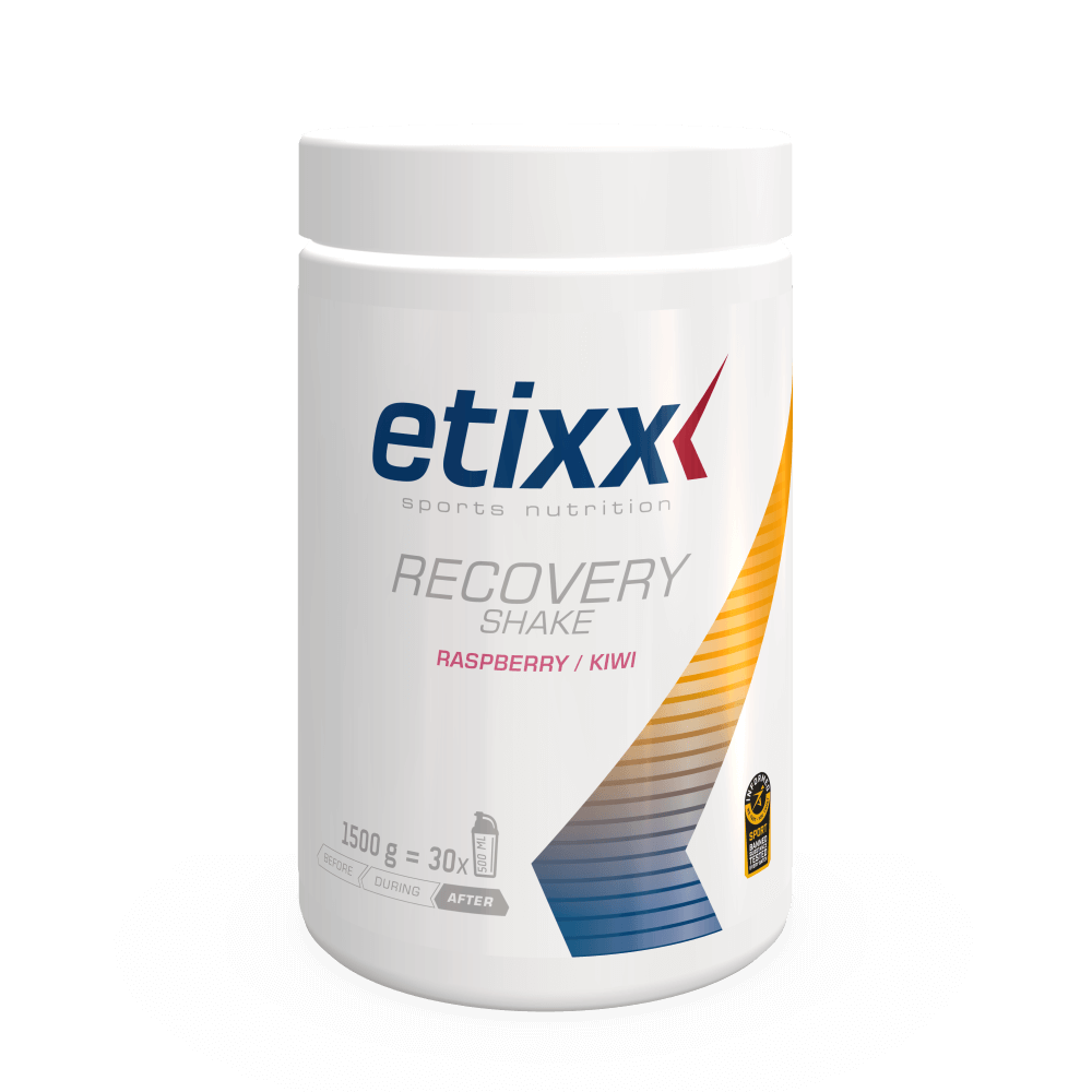 De Recovery Shake van Etixx is een hoogwaardige herstelshake om te gebruiken na afloop van je training of sport. De Recovery Shake bestaat uit een rijke mix van glucose, fructose, weiproteïne en vitaminen. Deze mix vult snel de glycogeenvoorraden aan. De toevoeging van eiwitten ondersteunen een snel herstel van de spieren na een intensieve training of wedstrijd. De vitamines B6 en C dragen bij tot de vermindering van vermoeidheid en moeheid. De shake bevat circa 37 gram koolhydraten en 9 gram eiwitten per portie. Een combinatie van eiwitten en koolhydraten werkt beter dan enkel eiwitten. De combinatie van eiwitten samen met koolhydraten worden namelijk beter opgenomen door je lichaam. De Etixx eiwitshake is verkrijgbaar in de smaken Chocolade en Framboos Kiwi. Verder kan je deze recovery drink bestellen in een 400 gram pot of 1500 gram voordeelverpakking.