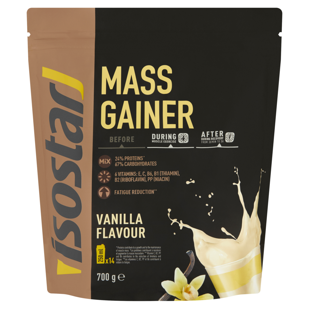 PowerPlay Isostar is de speciale 'krachtlijn' van Isostar sportvoeding. Mass Gainer is het product dat uitermate geschikt is voor duursporters die in de winter een zware krachttraining willen doen en meer spiermassa willen ontwikkelen. Tevens is de eiwitshake geschikt voor krachtsporters die zeer weinig massa (gewicht) hebben en willen groeien in spiermassa. Sporters die van nature ontzettend veel kunnen 'eten zonder aan te komen', hebben bijzonder baat bij de Isostar Mass Gainer PowerPlay sportvoeding. Het product heeft een verhouding van 24% eiwitten en 68% koolyhdraten. Zowel de eiwitten als de koolhydraten bestaan uit verschillende bronnen. De toevoeging van eiwitten ondersteunen zo een snel herstel van de spieren na een intensieve training of wedstrijd. Eiwitten bevorderen niet alleen een optimaal spierherstel, maar dragen ook bij tot de instandhouding van de spiermassa. Tevens bevat het calcium. Calcium speelt een rol bij het behouden van sterke spieren. Magnesium draagt bij tot een normale werking van de spieren en draagt bij tot de vermindering van vermoeidheid en moeheid.