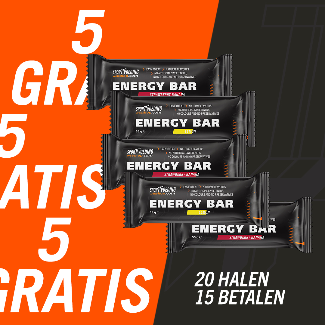 Energy Bar is dé meest verkochte energiereep van de Benelux. Niet voor niets favoriet onder vele hardlopers, wielrenners, mountainbikers en andere duursporters. Nu tijdelijk 20 halen, slechts 15 betalen. Pak je voordeel en ontvang er 5 namens ons!