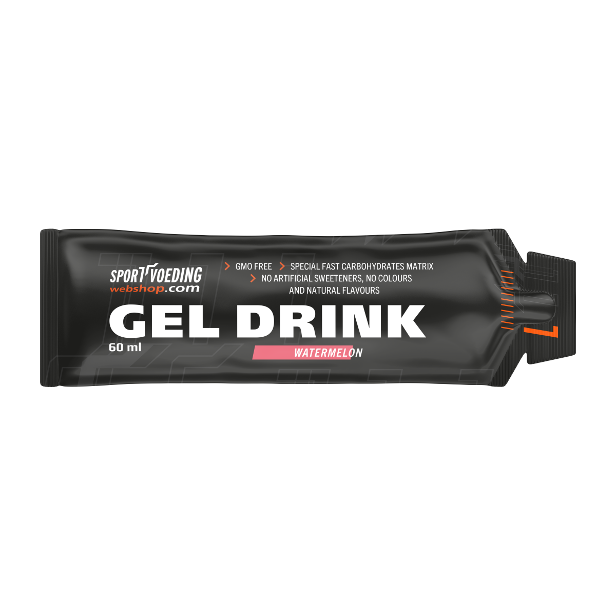 De SportvoedingWebshop Gel Drink is het sportvoeding product dat onze Special Fast Carbohydrates Matrix bevat. Hoewel het zowel de koolhydraten Maltodextrine en Isomaltulose bevat is de samenstelling tussen deze koolhydraten anders dan bij de Long Energy Drink. Dat maakt de Gel Drink geschikt als laatste isotone gel in de race. De Special Fast Carbohydrates Matrix geeft het lichaam snel energie. Een Gel Drink bevat 60ml en voorziet je lichaam van 26 gram koolhydraten. De isomaltulose dat een bron is van glucose en fructose geeft snelle energie. Het maakt de energy gel geschikt voor het laatste deel van de inspanning. Een Gel Drink bevat 103 kcal en is goed voor 30 - maximaal 45 minuten inspanning. Water drinken na inname is niet nodig. Uiteraard is het aan te bevelen om tijdens de inspanning voldoende te drinken. Onze ontwikkelde 2 in 1 Iso Drink sportdrank / dorstlesser is hiervoor zeer geschikt. De Gel Drink: No articifial sweeteners and no colours.
