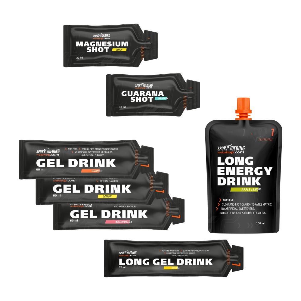 Het Gels Proefpakket bevat Long Energy Drink, Gel Drink, Long Gel Drink, Guarana Shot en Magnesium Shot.
