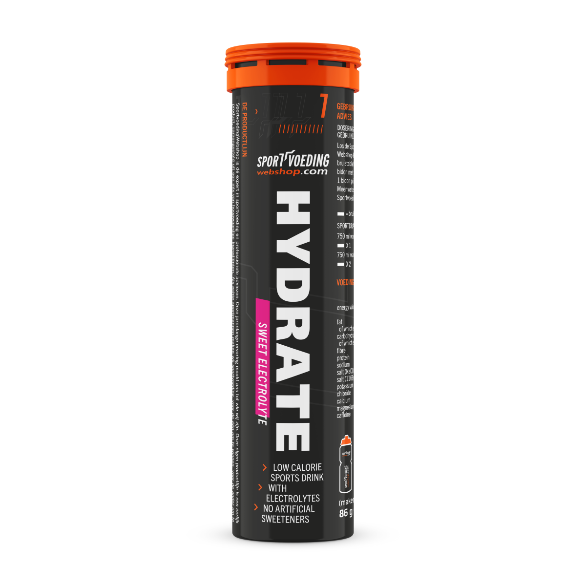 HYDRATE electrolyte, verkrijgbaar in 4 heerlijke smaken, is de Low Calorie Sports Drink mét Electrolyten, Mineralen en Zouten in de vorm van bruistabletten. Het is verpakt in een handig meeneem buisje. Ideaal om onderweg je Low Calorie Sports Drink ter plekke te bereiden. HYDRATE electrolyte bereid je snel, is praktisch en van hoogwaardige kwaliteit. Een buisje bevat 20 tabletten. Goed voor 20 bidonvullingen en maar liefst 15 literLow Calorie Sports Drink. Waarom ontwikkelden wij HYDRATE electrolyte? Achtergrondinformatie en een nadere blik over ons nieuwste product dat wij met trots toevoegen aan ons assortiment sportvoeding.