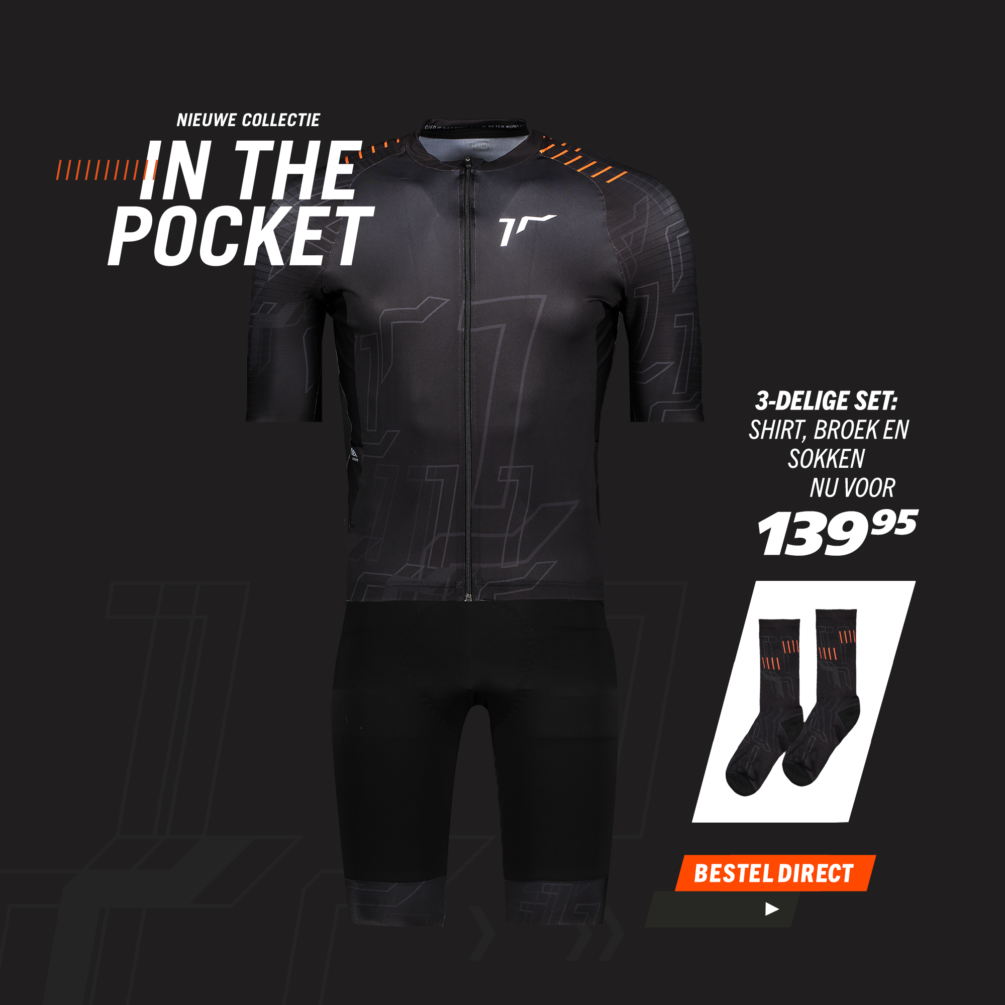 Dit complete wielertenue bestaat uit een strak wielershirt met maar liefst 6 zakken, een comfortabele fietsbroek en perfect aansluitende sportsokken – ideaal voor wielrenners, triatleten, gravelrijders en andere fietsers. Het is onderdeel van onze INTHEPOCKET collectie. Onze sportvoeding is namelijk álles behalve rommel, het is winst op zak. Hou het daar!