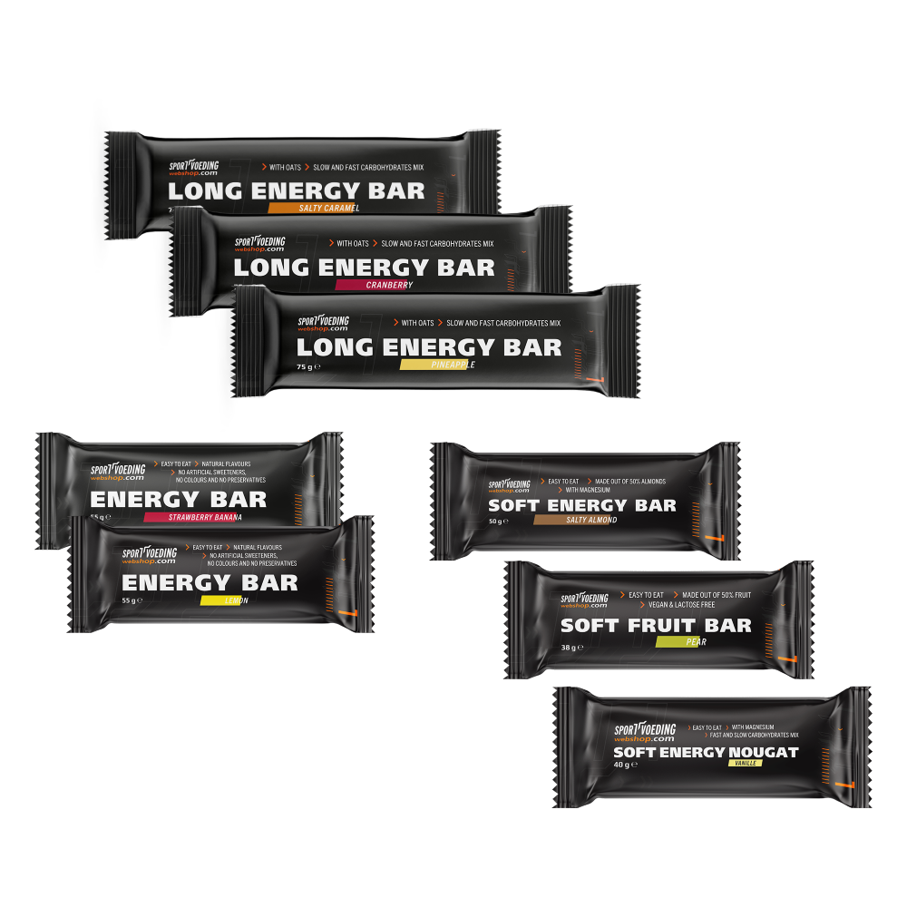 Het Repen Proefpakket bevat Long Energy Bar, Energy Bar, Soft Fruit Bar, Soft Energy Bar en Soft Energy Nougat.