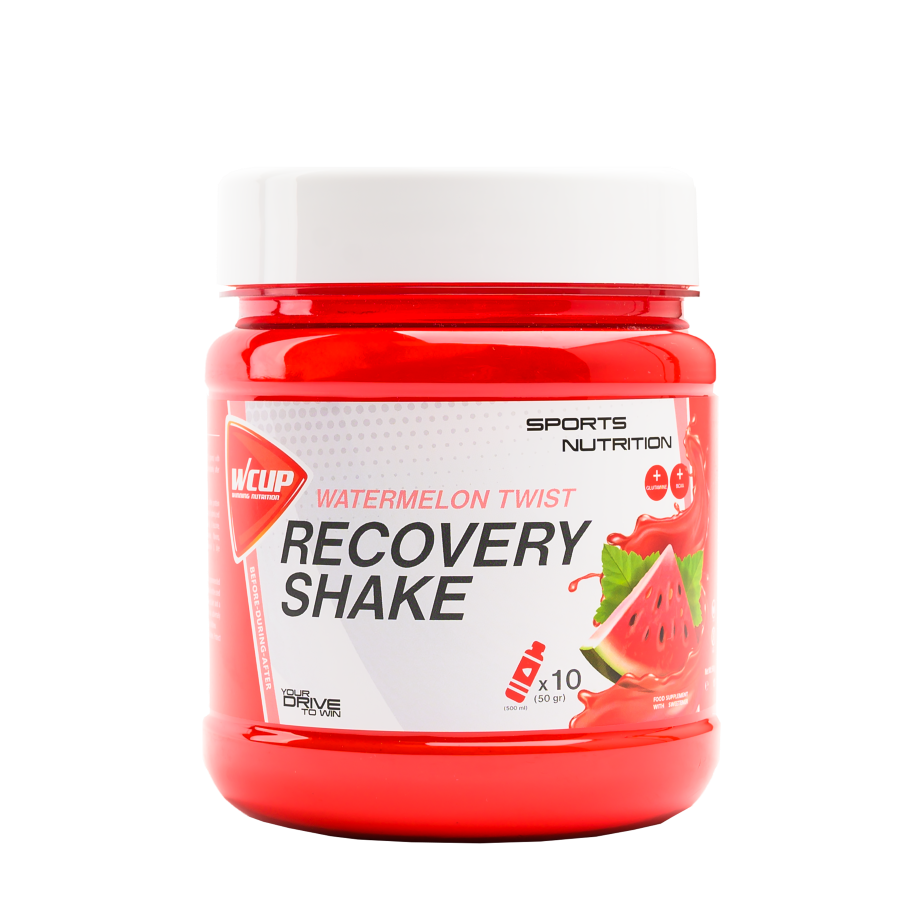 De Wcup Recovery Shake is een hersteldrank die voor 80% uit koolhydraten en bijna 20% uit eiwitten bestaat. Het product is geheel vetvrij. Daarnaast bevat het belangrijke aminozuren complex: BCAA (Branched Chain Amino Acids). De toevoeging van eiwitten ondersteunen een snel herstel van de spieren na een intensieve training of wedstrijd. Eiwitten bevorderen niet alleen een optimaal spierherstel, maar dragen ook bij tot de instandhouding van de spiermassa. Daarnaast bevat het vitamine C. Vitamine C helpt bij het behoud van een goede weerstand tijdens en na fysieke inspanning. Magnesium draagt bij tot een normale werking van de spieren en bij tot de vermindering van vermoeidheid en moeheid. De hersteldrank is verkrijgbaar in de smaken Orange, Cherry Vanilla en Watermelon.