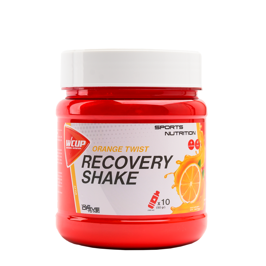 De Wcup Recovery Shake is een hersteldrank die voor 80% uit koolhydraten en bijna 20% uit eiwitten bestaat. Het product is geheel vetvrij. Daarnaast bevat het belangrijke aminozuren complex: BCAA (Branched Chain Amino Acids). De toevoeging van eiwitten ondersteunen een snel herstel van de spieren na een intensieve training of wedstrijd. Eiwitten bevorderen niet alleen een optimaal spierherstel, maar dragen ook bij tot de instandhouding van de spiermassa. Daarnaast bevat het vitamine C. Vitamine C helpt bij het behoud van een goede weerstand tijdens en na fysieke inspanning. Magnesium draagt bij tot een normale werking van de spieren en bij tot de vermindering van vermoeidheid en moeheid. De hersteldrank is verkrijgbaar in de smaken Orange, Cherry Vanilla en Watermelon.